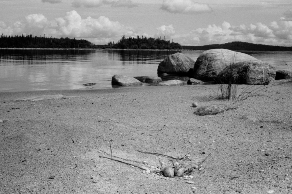 Nous nous sommes promenés sur le réservoir en gros canot à moteur Norton qui sert dorénavant de moyen de transport sur cette immense étendue d’eau. Avec nos hôtes, nous avons découvert l’île aux oeufs de goélands. Ensuite, ils nous ont fait découvrir des sites de campement de territoires familiaux.